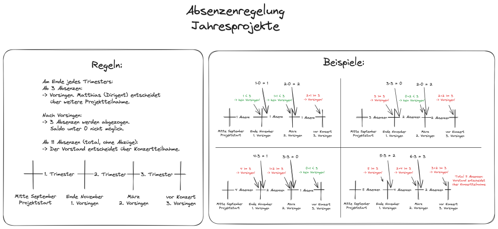 Das was wir Vorsingen genannt haben, sind in der Realität Zusatzproben in kleineren Gruppen. Sie sollen dir die Möglichkeit geben, unklare Stellen noch einmal anzuschauen und unserem musikalischen Leiter die Sicherheit, dass die verpassten Proben nachgearbeitet wurden. Die Termine für diese Zusatzproben findest du im Probenplan.